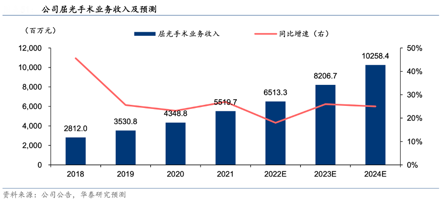 經典案例:根據公司公告、華泰研究預測等綜合資訊表明,愛爾眼科公司不斷加大屈光手術業務建設力度,持續引入行業領先的先進技術和高端設備,目前已建立了全面的個性化定制屈光手術解決方案體系。作為公司的核心業務之一,屈光手術目前已成為公司收入占比最大的業務板塊,其 2021 年實現收入 55.2 億元,同比增長26.9%,占總營業收入比例為 36.8%。