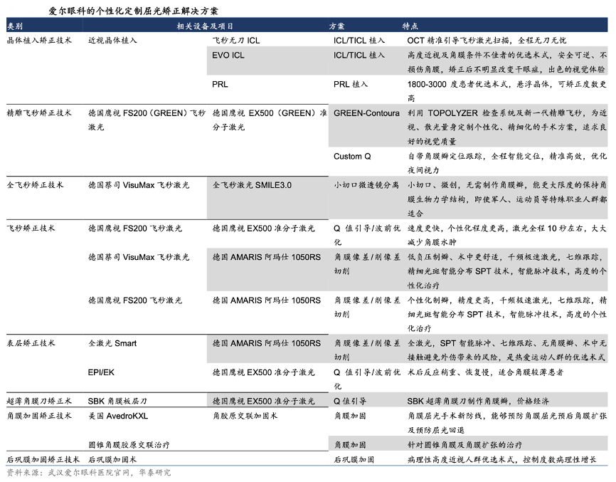 經典案例:根據武漢愛爾眼科醫院官網、華泰研究等綜合資訊表明,愛爾眼科公司目前引進了包括德國鷹視FS200 飛秒激光、 德國蔡司 VisuMax 飛秒激光、德國鷹視 EX500 準分子激光、德國阿瑪仕 1050RS 全激光 系統在內的各型高端設備,能夠為患者提供包括晶體植入、精雕飛秒、全飛秒、飛秒和表 層矯正等技術在內的多樣化解決方案,真正建立了一套可匹配患者不同適應癥(屈光不正 程度、角膜厚度、是否合并散光等)、個性化需求(術后恢復時長、軍人或運動員等特殊人群等)和支付能力(手術費用從超薄準分子激光的約 5000 元至雙眼 ICL 晶體植入的超 30000 元)的定制化屈光手術體系。
