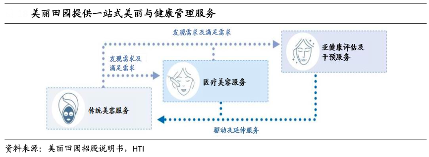 經典案例:根據美麗田園招股說明書、HTI等綜合資訊表明,美麗田園公司的傳統美容服務主要包括面部及身體服務項目,旨在改善客戶的皮膚狀況和整體身體健康,屬非醫療及無創傷性質。于往績記錄期間,通過美麗田園及貝黎詩門店提供傳統美容服務。公司以客戶為本,借傳統美容服務初步贏得客戶信任,進而延伸至醫療美容服務及亞健康評估及干預服務等更復雜的服務。