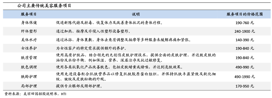 經(jīng)典案例:根據(jù)美麗田園招股說明書、HTI等綜合資訊表明,美麗田園傳統(tǒng)美容服務(wù)項目眾多,整體客單價較低。截至 2022 年 12 月 20 日,公司提供 31 種傳統(tǒng)美容服務(wù)項目,涵蓋超過 130 個 SKU,包括身體保健、纖體塑形、美體水療、膚質(zhì)管理、膚色調(diào)理等項目,服務(wù)項目的價格范圍不超過 2000 元,大部分項目集中在 1000 元以下。