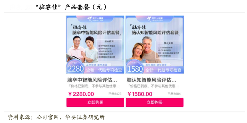 經典案例:根據公司官網、華安證券研究所等綜合資訊表明,美年健康研究 AI 技術結合健康體檢,推出腦睿佳(含腦區 AI 分割重建技術)、眼底分析(含 AI 眼底照相分析技術)、冠脈鈣化積分(含 AI 自動判定鈣化情況技術)等數字化升級產品。據公司官網數據,肺結節均價 1299 元;腦睿佳產品平均價格 1930 元,平均銷售量達 5500 單。推出包含鈣化積分 AI 檢查的全年齡臻愛深度 A~E5 款套餐,單價 1500~12000 元,為消費者提供更具針對性、個性化的多樣化產品。