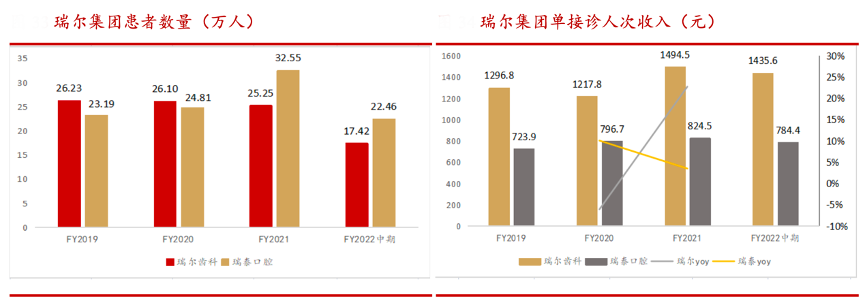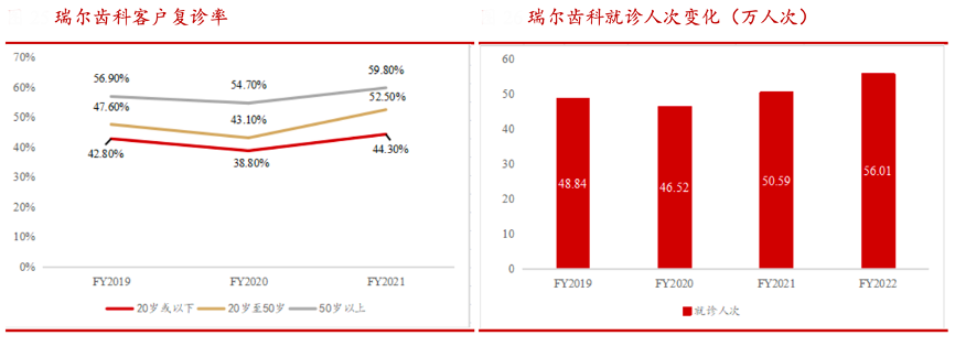 經典案例:根據華西證券等綜合資訊表明,瑞爾獲客能力穩中有升,新老顧客齊發力,次均收入在高位運行。2021 財年瑞爾齒 科接待患者人數 25.25 萬,保持穩定態勢;瑞泰口腔接待患者人數 32.55 萬, CAGR=18.5%,整體增幅較大。公司每年吸引大批新患者前來診療,客群持續擴大,輻射范圍明顯拉大,患者年齡集中于 20-50 歲范圍,占比差距不大,分別為 70%、66%。