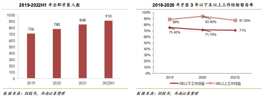 經(jīng)典案例:根據(jù)招股書、西南證券等綜合資訊表明,瑞爾公司通過多種途徑招募牙 醫(yī),包括在中國北京大學(xué)口腔醫(yī)學(xué)院、四川大學(xué)華西口腔醫(yī)學(xué)院和首都醫(yī)科大學(xué)等一流口腔醫(yī)學(xué)院進(jìn)行校園招聘,同時(shí)利用橫向招聘,主要自公立醫(yī)院聘 請富有才干的牙醫(yī),醫(yī)生總?cè)藬?shù)從 2019 年的 706 人增加至 2022 年 9 月的 910 人。超過 46.8%的全職牙醫(yī)擁有碩士或以 上學(xué)位,208 名約 23.6%的全職牙醫(yī)擁有超過 15 年的牙科從業(yè)經(jīng)驗(yàn);132 名或 15.0%的全 職牙醫(yī)擁有 10 年至 15 年的牙科從業(yè)經(jīng)驗(yàn)。全職牙醫(yī)團(tuán)隊(duì)平均擁有 10.4 年的行業(yè)經(jīng)驗(yàn)。
