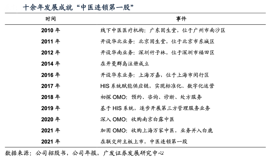 經典案例:根據公司招股書、公司年報、廣發證券發展研究中心等綜合資訊表明,固生堂是一家中醫醫療健康服務提供商,通過線下醫療機構及線上醫療健康平臺,為客戶提供全面的中醫醫療健康服務及產品。公司于2017年建立 HIS系統賦能供應鏈,實現標準化、數字化運營,分別于2020年和2021年收購線上 醫療健康平臺白露、萬家,進一步深化了線上線下相結合的業務模式。