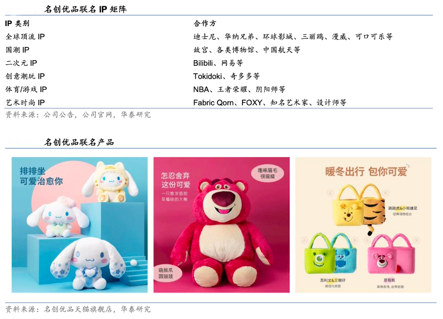 經典案例:根據公司公告、公司官網、名創優品天貓旗艦店、華泰研究等綜合資訊表明,2016 年以來名創優品陸續和粉紅豹、Hello Kitty、芝麻街、Universal、迪士尼、故宮、NBA、漫威、中國航天、陰陽師、Bilibili 等知名 IP 推出聯名產品,截至 2023 年 6 月 30 日,名創優品已與 82 個 IP 進行聯名合作。
