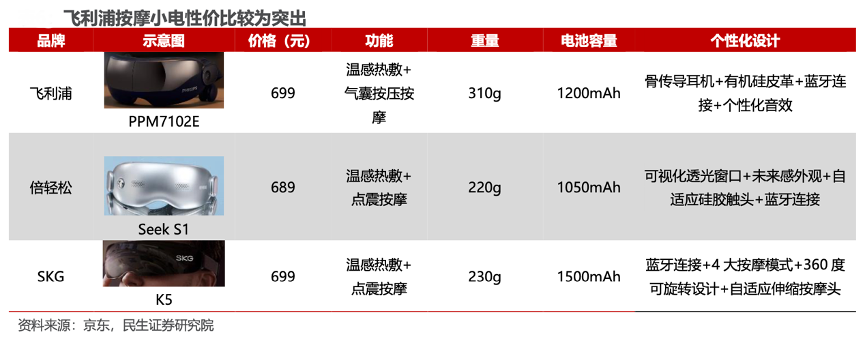 經(jīng)典案例:根據(jù)京東、民生證券研究院等綜合資訊表明,飛利浦按摩小電不僅具備先進(jìn)的技術(shù),更注重產(chǎn)品的性價(jià)比。以飛利浦旗下最暢銷產(chǎn)品眼部按摩儀 PPM7102E 為例,該產(chǎn)品凈重 310g,與同價(jià)位段的友商按摩儀產(chǎn)品相比,除了集合熱敷、按摩等基本功能外,還添加了骨傳導(dǎo)耳機(jī)和個(gè)性化音效等同價(jià)位段產(chǎn)品所不具備的功能,力求以相同的價(jià)格為消費(fèi)者帶來(lái)除傳統(tǒng)眼部按摩外的個(gè)性化體驗(yàn)。