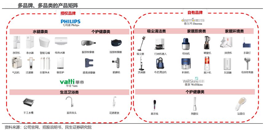 經(jīng)典案例:根據(jù)公司官網(wǎng)、招股說(shuō)明書、民生證券研究院等綜合資訊表明,德爾瑪公司建立了成熟的品牌矩陣,通過(guò)不同品牌覆蓋不同品類產(chǎn)品,切入不同的消費(fèi)場(chǎng)景。其中,自有品牌 “德爾瑪”主要覆蓋吸塵清潔類、加濕環(huán)境類以及家居廚房類等家居環(huán)境類產(chǎn)品;“飛利浦”品牌主要覆蓋水健康類及個(gè)護(hù)健康類等產(chǎn)品。