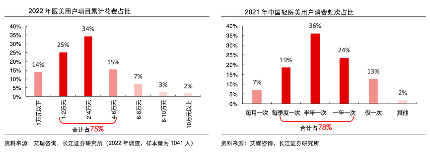 經(jīng)典案例:根據(jù)艾瑞咨詢、長(zhǎng)江證券研究所等綜合資訊表明,2022年醫(yī)美用戶人均累計(jì)消費(fèi)金額集中于 1-6 萬元,消費(fèi)頻次集中于每年 1-2 次,高客單價(jià)+較低消費(fèi)頻次的行為特征使得消費(fèi)者對(duì)門店選址和交通距離的敏感性降低,因 而單店客群輻射范圍較大,承載能力強(qiáng)且口碑較好的醫(yī)院甚至吸引求美者跨省慕名就醫(yī)。