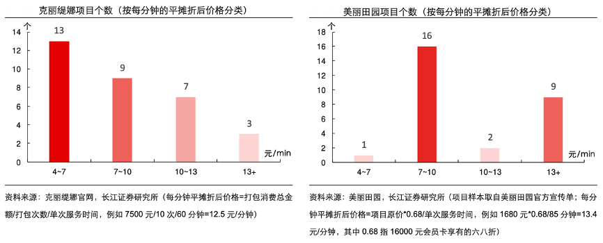 經典案例:根據克麗緹娜官網、美麗田園、長江證券研究所等綜合資訊表明,從高階項目每分鐘平攤折后價格來看,克麗緹娜主要按 10 次項目打包價出售,計算“打包消費總金額/打包次數/單次服務時間”即得到每分鐘平攤折后價格,其多數項目為 4-10 元/ 分鐘;而美麗田園主要按會員充值打折的銷售方式,計算項目原價*中等級別折扣/單次服務時間,發現其多數項目為 7-10 元/分鐘以及 13 元+/分鐘,實際價格明顯更高一些。