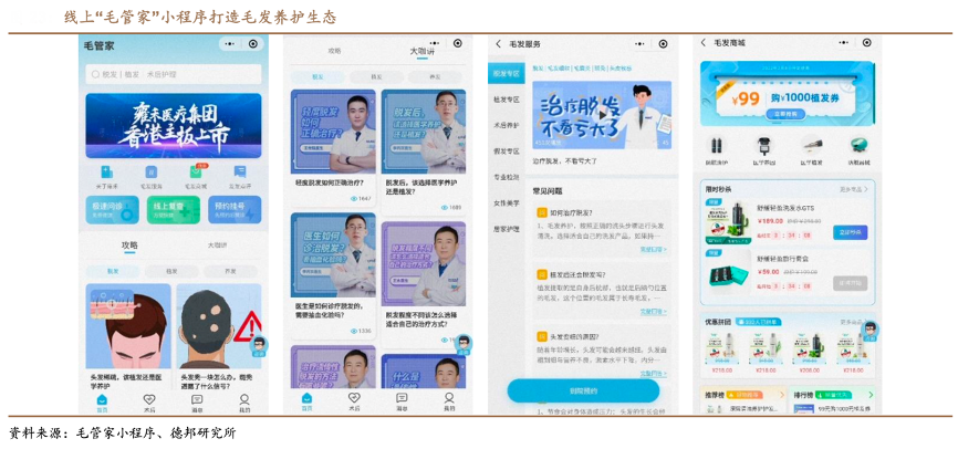 經(jīng)典案例:根據(jù)毛管家小程序、德邦研究所等綜合資訊表明,雍禾醫(yī)療公司積極推進在線醫(yī)療服務,已建立一支在線醫(yī)療團隊,在微信小程序上開發(fā)“毛管家”小程序,擁有超 81 萬名注冊用戶,可為患者進行植發(fā)手術(shù)介紹、查詢醫(yī)生執(zhí)照及價格信息等,可實時上傳患者病歷等文件,從而提供便捷專業(yè)的在線咨詢、術(shù)后復查服務,提升手術(shù)透明性,引導行業(yè)規(guī)范化。