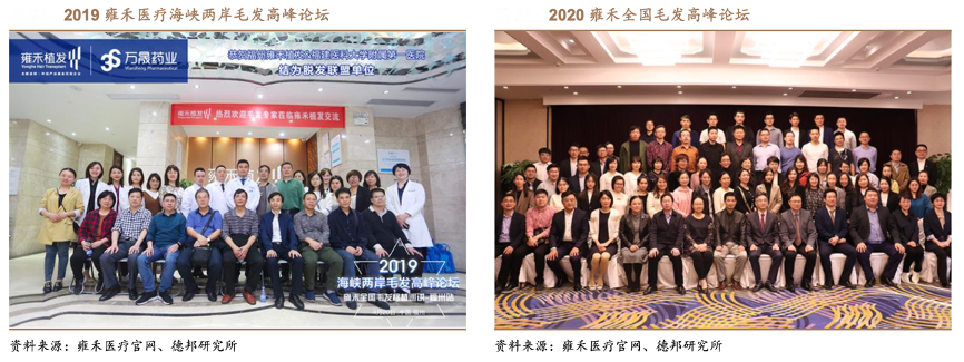 經(jīng)典案例:根據(jù)雍禾醫(yī)療官網(wǎng)、德邦研究所等綜合資訊表明,雍禾醫(yī)療公司 2020 年在鄭州與杭州舉辦雍禾醫(yī)療毛發(fā)高峰論壇。2019 年雍禾醫(yī)療與萬(wàn)晟藥業(yè)聯(lián)合主辦的全國(guó)毛發(fā)主題巡講,聚集國(guó)際頂尖植發(fā)專家與國(guó)內(nèi)行業(yè)精英代表進(jìn)行巔峰對(duì)話,深度探討植發(fā)行業(yè)發(fā)展趨勢(shì)和技術(shù)創(chuàng)新未來(lái)發(fā)展。