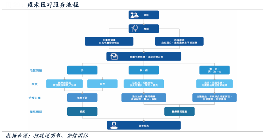 經(jīng)典案例:根據(jù)招股說(shuō)明書、安信國(guó)際等綜合資訊表明,植發(fā)機(jī)構(gòu)具有一套標(biāo)準(zhǔn)化流程,以雍禾醫(yī)療為例,患者首次就診并完成登記后,醫(yī)生會(huì)用 毛囊檢測(cè)儀來(lái)測(cè)試患者頭皮和毛發(fā)狀態(tài),若進(jìn)行植發(fā)手術(shù)還需要檢測(cè)血液,以確定是否符合做手術(shù)的條件。對(duì)于早期毛發(fā)患者問(wèn)題,建議醫(yī)療養(yǎng)固治療,對(duì)于頭發(fā)稀疏或光裸的毛囊閉合患者,建議采用植發(fā)手術(shù)治療。