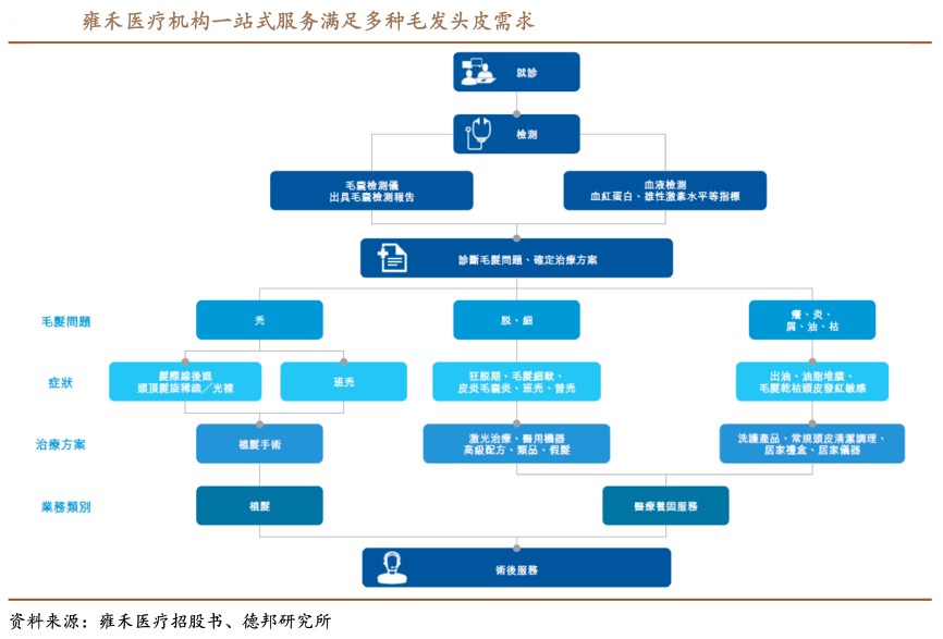 經(jīng)典案例:根據(jù)雍禾醫(yī)療招股書、德邦研究所等綜合資訊表明,雍禾醫(yī)療為造訪醫(yī)療機(jī)構(gòu)的患者提供一站式毛發(fā)醫(yī)療服務(wù),通過(guò)就診檢測(cè)與診斷來(lái)判斷患者頭皮毛發(fā)問題嚴(yán)重程度,而進(jìn)行針對(duì)式解決方案。從普通頭皮問題到脫發(fā)毛發(fā)細(xì)軟,再到斑禿發(fā)際線后退,公司都可提供相應(yīng)的解決方案,從而提升客戶留存率與滿意度。