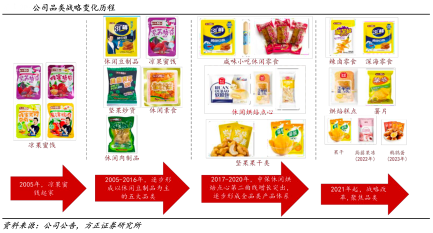 經典案例:根據公司公告、方正證券研究所等綜合資訊表明,從產品品類來看,自 2005 年成立,鹽津鋪子公司從蜜餞涼果起步,2017年上市后,公司 緊跟市場變化趨勢,每年不斷調整品類戰略,其中2021年進行了較大戰略改革,從全品類戰略調整為聚焦重點品類,聚焦辣鹵零食、深海零食、休閑烘焙、薯類零食、蛋類零食、蒟蒻果凍、果干堅果等七大核心品類。