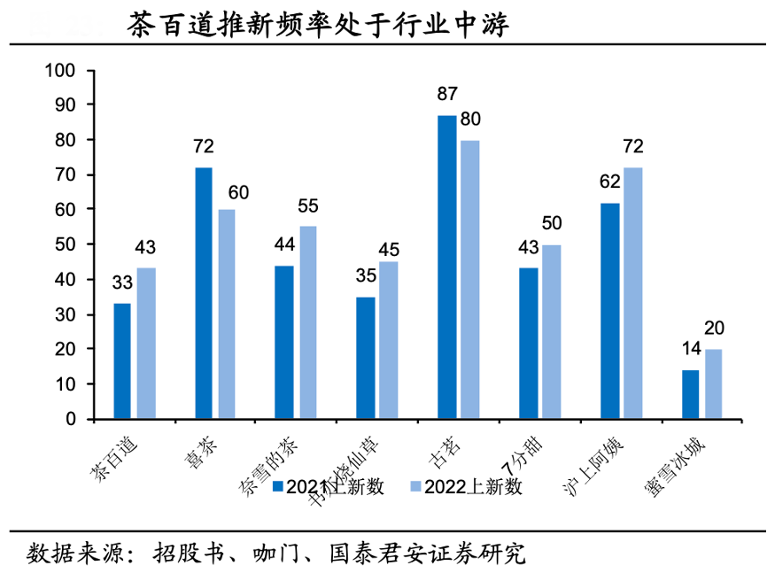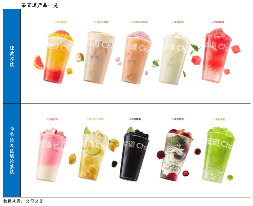 經典案例:根據招股書、咖門、國泰君安證券研究等綜合資訊表明,茶百道公司持續 對消費者口味喜好的變化趨勢進行調研與預判,通常每隔幾個月即上新季節限定款或區域限定款產品的方式持續為消費者帶來新穎、驚喜的茶飲體驗。2023 年,茶百道開發出約 250 多款產品,并推出了 48 款新品,升級了 13 款產品,飽受消費者好評。