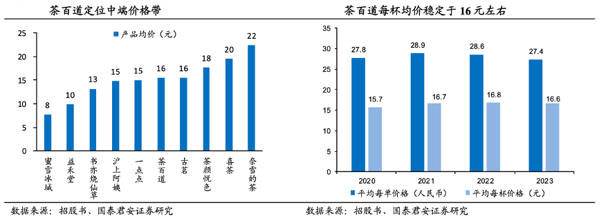 經(jīng)典案例:根據(jù)招股書、國泰君安證券研究等綜合資訊表明,茶百道定位中端價格帶,性價比優(yōu)勢顯著。茶百道每杯均價穩(wěn)定在 16 元左右, 原材料環(huán)節(jié)嚴格把控,多為原葉和鮮果,產(chǎn)品力穩(wěn)定。