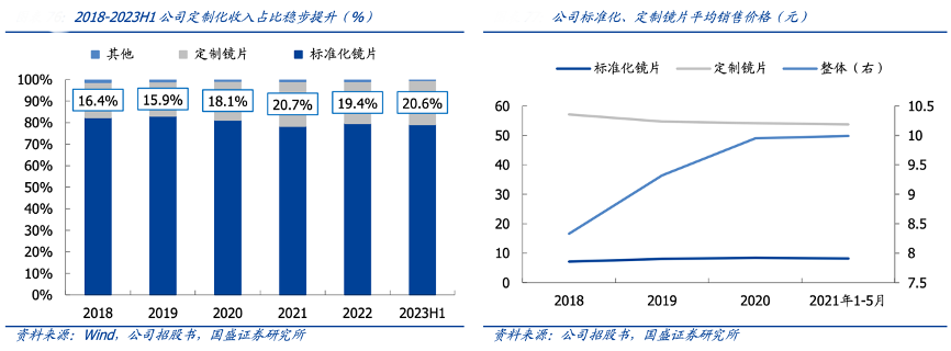 經(jīng)典案例:根據(jù)wind、公司招股書(shū)、國(guó)盛證券研究所等綜合資訊表明,定制化鏡片對(duì)廠(chǎng)商的設(shè)計(jì)&生產(chǎn)制造&服務(wù)能力提出較高要求、壁壘較高。康特耐公司定制化鏡片收入占比逐年穩(wěn)步提升,2018- 2022 公司定制化收入從 1.40 億元增長(zhǎng)至 3.03 億元(CAGR 為 21.3%),增速快于標(biāo)準(zhǔn) 化鏡片(CAGR 為 15.3%)。截至 2023H1,定制化占比達(dá)到 20.6%。