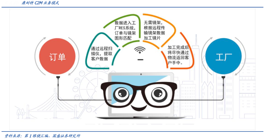 經(jīng)典案例:根據(jù)第1眼鏡匯編、國(guó)盛證券研究所等綜合資訊表明,康耐特光學(xué)依托 C2M 新業(yè)態(tài)模式滿(mǎn)足終端客戶(hù)一站式需求。C2M 模式指工廠(chǎng)直面終端銷(xiāo)售,主要客戶(hù)為眼科醫(yī)院/眼鏡店/診所/連鎖店/大型商超/在線(xiàn)網(wǎng)店。公司遠(yuǎn)程系統(tǒng)建設(shè)完善,用戶(hù)在線(xiàn)訂單系統(tǒng)下單后,信息直接傳輸至公司軟件&生產(chǎn)設(shè)備;同時(shí)也可以和客戶(hù)自有系統(tǒng)打通,提升客戶(hù)下單便捷性&交付效率。