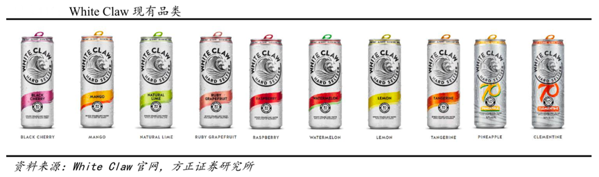經典案例:根據White Claw官網、方正證券研究所等綜合資訊表明,White Claw 采用的“純粹釀造法”(BrewPure),并注冊專利。“純粹釀造法”運用純天然成分,不含谷物,所釀酒口感較普通麥芽飲料更清新自然,與水果風味更易 融合。口味方面由最開始的三種口味天然酸橙、黑櫻桃、紅寶石葡萄柚拓展至 10 種,盡管推新速度較慢,但持續推進品種豐富度,基本覆蓋最受消費者歡迎的硬蘇打水口味。