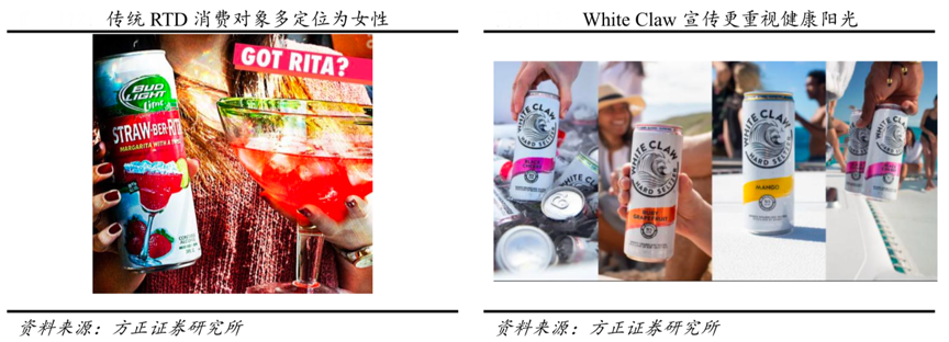 經典案例:根據White Claw官網、方正證券研究所等綜合資訊表明,White Claw 的流行主要抓住了美國年輕人兩大消費潮流:健康意識和性別包容意識。年輕消費群體的健康意識和身材管理意識增強,傳統麥芽釀造的啤酒熱量、酒精度較高,而White Claw 主打的酒精度數 低(為 5%)、低卡(一瓶 100 大卡)、低碳水化合物(僅 2 克)、無麩質等特點均精準切合目標客戶需求。White Claw 中性化的瓶身外觀在設計上也模糊了男女消費者之間的性別界限。