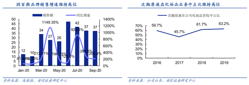 經典案例:根據淘數據、公司公告、安信證券研究中心等綜合資訊表明,結合天貓旗艦店公開數據,潤百顏次拋原液累計賣出 1.12 億支(以 2019 年年報披露的單價 9.2 元/支計算約合 10.3 億人民幣),2018年以來在其公司化妝品業務營收中占比超過 60%,次拋原液產品賣點為“次拋包裝+玻尿酸原液”,具備專利玻尿酸分子技術,極具“大單品”雛形。
