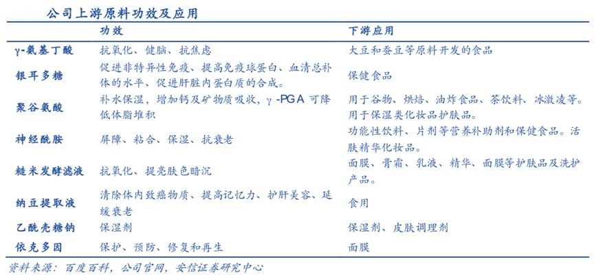 經典案例:根據百度百科、公司官網、安信證券研究中心等綜合資訊表明,華熙生物依托微生物發酵平臺及產業化優勢,可開發出多種活性物質,目前包括γ-氨基丁酸、銀耳多糖、聚谷氨酸、神經酰胺、糙米發酵濾液、納豆提取液、乙酰殼糖鈉、依克多因等多元生物活性物質產品已開發上市,有望在功能性護膚品領域得到進一步應用。