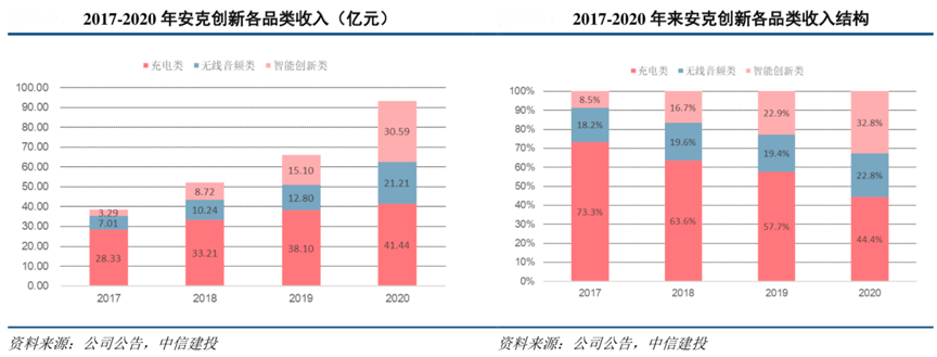 經典案例:根據公司公告、公司官網、中信建投等綜合資訊表明,安克創新2017-20 年收入由 28.33 億元增至41.44 億元,CAGR 為 13.5%。無線音頻類和智能創新類兩大新銳品類 2017-20年收入 CAGR 分別為44.6%、110.3%,2020 年收入分別 21.21 億元、30.59 億元,合計占比已超55%,反映公司多元化推進效果優異,尤其是智能創新類增長迅猛,2019年收入已超越無線音頻類,2020年繼續同比高增102.63%。