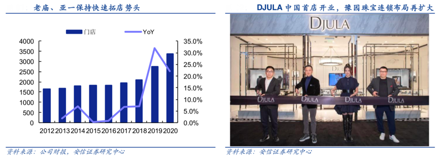 經典案例:根據公司財報、公司招股說明書、安信證券研究中心等綜合資訊表明,珠寶時尚業務是豫園股份公司支柱產業之一 ,旗下擁有“老廟”和“亞一”兩大知名品牌,以直營零售、批發為主要模式拓展連鎖網絡,2020 年老廟 亞一門店凈增 608 家、保持快速拓店勢頭,截止 2020 年末門店數增至 3367 家(其中 3160 家加盟店),同時收購法國珠寶品牌 Djula,亦已在京滬開有直營店 12 家。