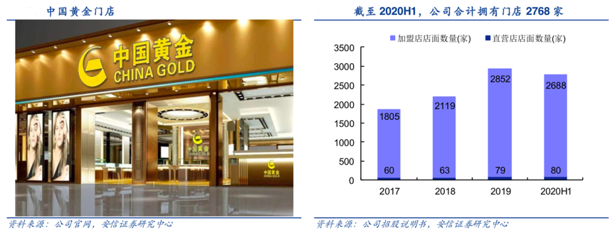 經典案例:根據公司官網、公司招股說明書、安信證券研究中心等綜合資訊表明,中國黃金公司通過在北京、上海、廣州等高線 級城市購物中心開設直營店打造品牌形象,通過在低線級城市開設加盟店擴張規模,截至 2020 上半年,公司擁有門店 2768 家,其中加盟店 2688 家,直營店 80 家。