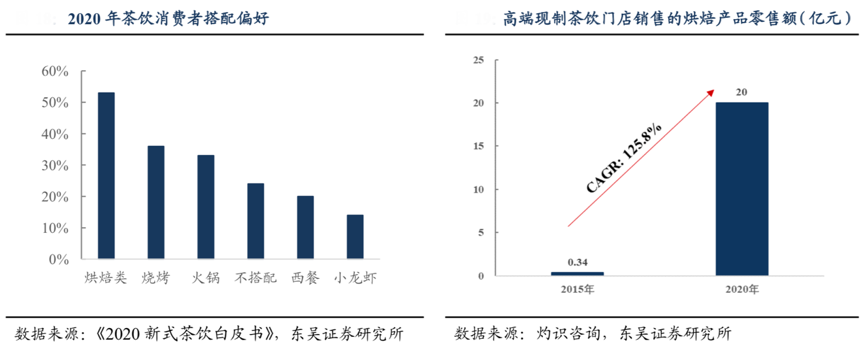 經典案例:根據《2020新式茶飲白皮書》、灼識咨詢、東吳證券研究所等綜合資訊表明,奈雪率先提出現制茶飲搭配烘焙產品的概念,推進“茶飲+烘焙”優勢互補,以相對高頻的茶飲帶動軟歐包的購買頻次,交叉銷售又提升了客單價,并強化了“下午茶” 和“聚會”的消費場景。根據灼識咨詢預計,截至 2020 年前三季度,按通過高端現制茶飲門店銷售的烘焙產品零售額計,奈雪市場份額在現制茶飲品牌中排名第一,達到 21.7%。
