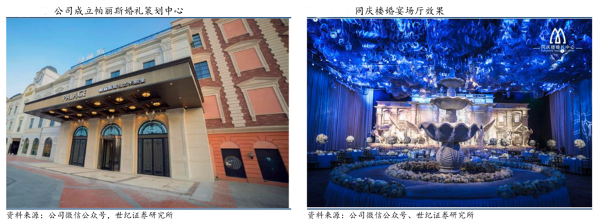 經(jīng)典案例:根據(jù)公司微信公眾號(hào)、世紀(jì)證券研究所等綜合資訊表明,同慶樓借助自身百年老字號(hào)的品牌優(yōu)勢(shì),精準(zhǔn)發(fā)力婚宴市場(chǎng)新藍(lán)海,2014 年前后,其開(kāi)始成立婚禮中心。2015 年起開(kāi)始和國(guó)內(nèi)宴會(huì)設(shè)計(jì)師合作,進(jìn)行一站式宴會(huì)酒店的升級(jí)和改造,將原本的傳統(tǒng)宴會(huì)廳改造成主題宴會(huì)廳。其現(xiàn)已形成了自己的婚慶策劃服務(wù)團(tuán)隊(duì),可向新人們提供場(chǎng)地、菜肴、婚禮策劃、主持、攝影等一站式服務(wù)。2019 年,同慶樓在 婚禮堂又進(jìn)行了不同形態(tài)的嘗試調(diào)整,成立帕麗斯婚禮策劃中心,升級(jí) 9 家 門店 12 個(gè)明星宴會(huì)廳,宴會(huì)菜肴同步全面升級(jí)。