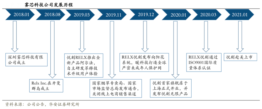 經典案例:根據公司公告、華安證券研究所等綜合資訊表明,霧芯科技公司在2018年 3 月發布第一代電子煙產品并迅速打開市場。2019 年,公司成立了國內首個獨立電子煙品牌實驗室 RELX Lab。2019 年 3 月,公司推出全新系列產品阿爾法。2019 年 9 月,悅刻靈點智能霧化煙發布。2019年其發布向陽花系統,打造全球嚴密未成年人保護網。