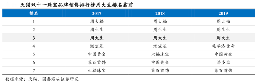 經典案例:根據天貓、國泰君安證券研究等綜合資訊表明,周大生電商渠道布局領跑行業,成立獨立團隊彰顯渠道變革決心。周大生自 2013 年起開始組建電 商團隊,加速布局電商渠道,2016年其品牌產品在天貓雙十一銷售排名前三。