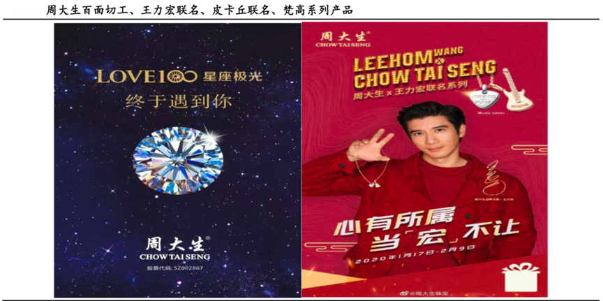 經典案例:根據公司官網、國泰君安證券研究等綜合資訊表明,周大生引進國外技術提高產品競爭力,持續進行產品創新。其是國內首家引入比利時“LOVE100”星座極光百面切工鉆石的公司,也是目前國內唯一一家擁有百面切工鉆石產品的品牌,這極大程度提高了公司的知名度和產品競爭力。同時擁抱國際化與年輕化大趨勢,牽手設計師,推出 IP 聯名款。