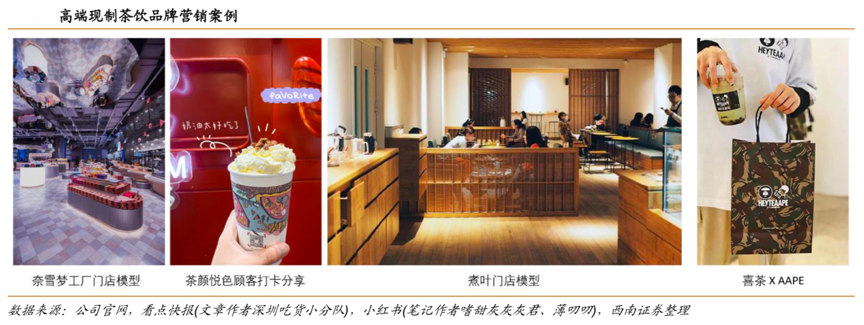 經典案例:根據公司官網、看點快報、小紅書、西南證券等綜合資訊表明,高端現制茶飲品牌正積極打造年輕人的“社交貨幣”,獲得品牌流量。喜茶黑金、奈雪夢工廠等超級大店模型適合拍照打卡,成為適合閑暇社交的“第三空間”。高端價位+新潮產品,讓好看好拍好分享的現制茶成為年輕人的社交貨幣;喜茶、奈雪與NIKE、AAPE 等知名品牌一年十余次的跨界聯名增強了品牌背書,同時互換了流量、粉絲,而煮葉通過煮茶師專業耐心的演示講解、茶顏悅色通過“永久求償權”和貼心的顧客服務與消費者之間形成了品牌獨特的待客 標簽。
