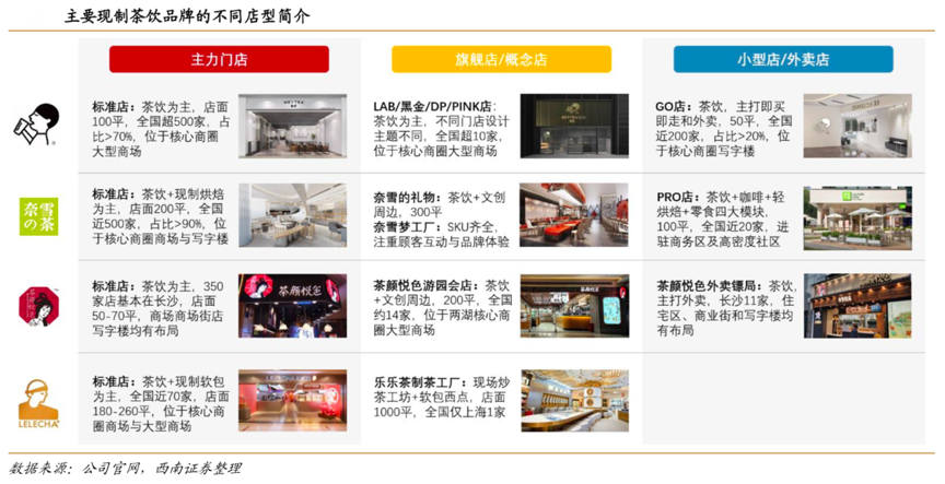 經典案例:根據公司官網、西南證券等綜合資訊表明,部分現制茶飲品牌嘗試多種店型運作,逐步優化渠道組合。其主力店以外的門店拓展分為兩個大類,第一類以展示品牌形象、增加消費者互動為目的,這類店型面積大、設計交互感強,如奈雪 夢工廠、茶顏悅色游園會;第二類以提升單店效率為目的,側重即買即走和外賣業務,門店面積小、讓高端品牌將渠道拓展至辦公場所、社區的同時,如奈雪 PRO、喜茶 GO等。