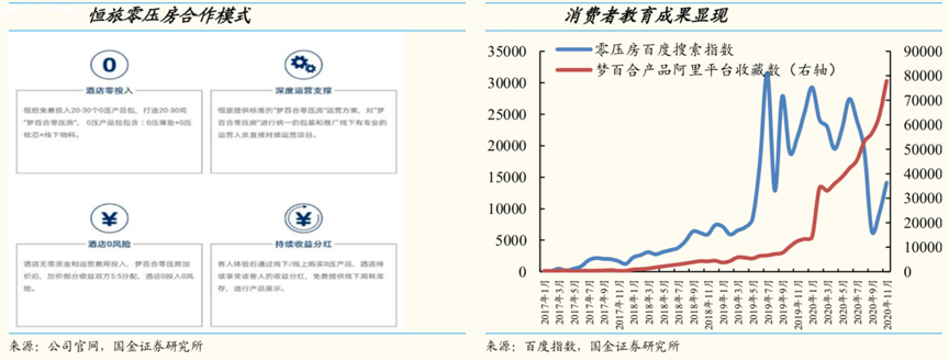 經典案例:根據公司官網、百度指數、國金證券研究所等綜合資訊表明,截止 2019年,夢百合的零壓房合作酒店 2800 多家,全國零壓房數量超過 30 萬間。零壓房的入住客人均可親身體驗公司產品,銷售渠道進一步前置。隨著零壓房覆蓋面逐漸鋪開后,消費者對零壓房關注度顯著提升,帶動夢百合產品關注度明顯提升,消費者教育成果逐步顯現。