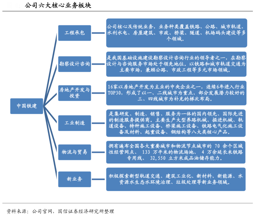 經(jīng)典案例:根據(jù)公司官網(wǎng)、國信證券經(jīng)濟(jì)研究所等綜合資訊表明,中國鐵建公司業(yè)務(wù)涵蓋工程承包、勘察設(shè)計(jì)咨詢、房地產(chǎn)、 投資服務(wù)、裝備制造、物資物流、金融服務(wù)以及新興產(chǎn)業(yè),經(jīng)營范圍遍及全國 32 個省、自治區(qū)、直轄市和香港、澳門特別行政區(qū),以及世界 116 個國家。其已經(jīng)從以施工承包為主發(fā)展成為具有科研、規(guī)劃、勘察、設(shè)計(jì)、施工、監(jiān)理、維護(hù)、運(yùn)營和投融資完整的行業(yè)產(chǎn)業(yè)鏈,具備了為業(yè)主提供一站式綜合服務(wù)的能力。