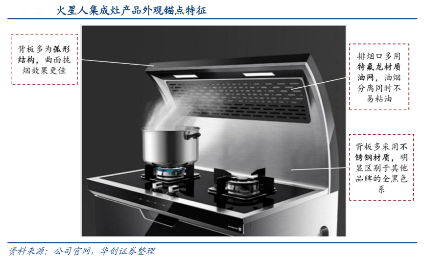 經典案例:根據公司官網、華創證券等綜合資訊表明,火星人旗下產品普遍具有共性的設計錨點,提升產品功能的同時有效提高辨識度。其采用不銹鋼材質,與其他品牌不同,火星人集成灶背板部分均采用不銹鋼材質,銀黑相間的外觀樣式更具辨識度。
