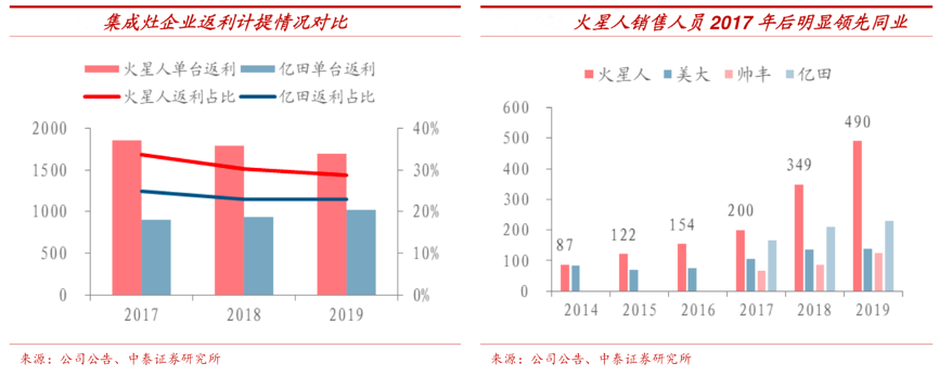 經(jīng)典案例:根據(jù)公司公告、中泰證券研究所等綜合資訊表明,火星人的差異化定價給其售后留下了充足的利潤空間,同時憑借這一賣“售后服務”模式迅速脫穎而出建立口碑。目前其可提供免費上門,購機三年內(nèi)兩次免費清洗等。售后由經(jīng)銷商承擔,所以火星人此前給經(jīng)銷商毛利空間高,下圖火星人返利比例高于同業(yè)可以驗證。2018年上線的“火星人極速服務小哥”將部分售后收歸自營,返利比例相對下降但銷售人員數(shù)量從 17 年 200 人增至 490 人,銷售費用也相應上升。