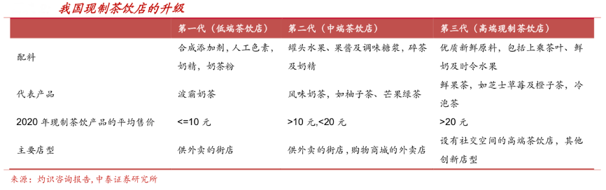 經典案例:根據灼識咨詢服務、中泰證券研究所等綜合資訊表明,現制茶飲店是我國現制茶飲的主要消費渠道,2020年約60%的現制茶飲市場總消費額來自現制茶飲店。現制茶飲店按照平均售價分為三類: 高端現制茶飲店、中端茶飲店、低端茶飲店。高端現制茶飲店界定為現制茶飲的平均售價不低于 20 元的現制茶飲店,使用優質、新鮮配料生產現制茶飲,及創造優質的茶飲體驗,布置讓顧客能夠社交及放松的空間。