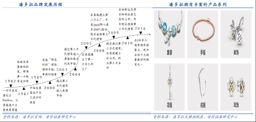 經(jīng)典案例:根據(jù)潘多拉官網(wǎng)、潘多拉天貓旗艦店、安信證券研究中心等綜合資訊表明,潘多拉于1982 年成立于丹麥,在 2000 年以“難忘時(shí)刻”的理念發(fā)力營銷,宣傳用手鏈上的一顆顆串珠來紀(jì)念屬于姑娘們自己人生中最重要的時(shí)刻,該理念的提出成為潘多拉發(fā)展史上最為重要的轉(zhuǎn)型。在產(chǎn)品上,潘多拉提供個(gè)性化并且物美價(jià)廉的銀飾 及其他非貴金屬珠寶,其戰(zhàn)略是多樣化串珠設(shè)計(jì)并不斷擴(kuò)寬產(chǎn)品品類,串珠和手鏈貢獻(xiàn)了公司近80%的營業(yè)額。