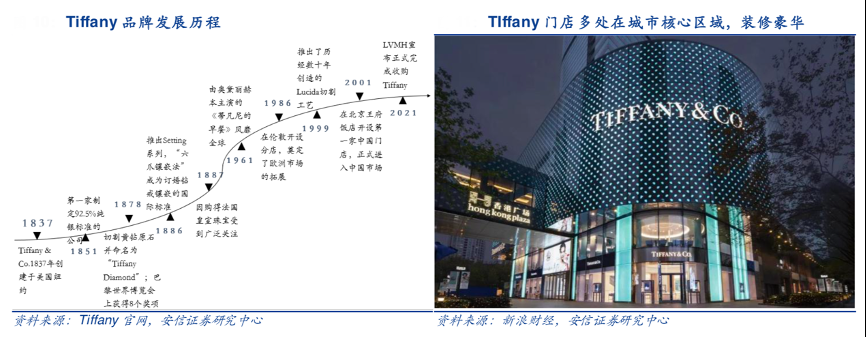 經(jīng)典案例:根據(jù)Tiffany官網(wǎng)、新浪財(cái)經(jīng)、安信證券研究中心等綜合資訊表明,以 Tiffany 為例,該品牌于 1837 年成立于美國,最初以制造銀質(zhì)餐具為主,在 1886 年推出經(jīng)典的“Setting 系列鉆戒”后,開始以訂婚鉆戒鑲嵌產(chǎn)品聞名。奢侈珠寶品牌通過持續(xù)的營銷、裝修豪華并位于城市核 心區(qū)域的門店進(jìn)一步維護(hù)其高端的品牌形象。