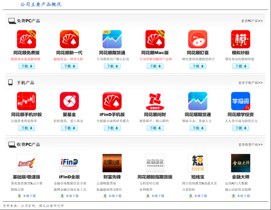 經(jīng)典方法:根據(jù)公司官網(wǎng)、國元證券研究院等綜合資訊表明,同花順公司以自身數(shù)據(jù)積累與多年服務(wù) C 端客戶的行業(yè)經(jīng)驗(yàn),產(chǎn)品主要可分為 PC 端產(chǎn)品及手機(jī)端產(chǎn)品。其中 PC 端產(chǎn)品可分為免費(fèi)產(chǎn)品與付費(fèi)產(chǎn)品。PC 端產(chǎn)品主要有同花順財(cái)經(jīng)網(wǎng)頁、同花順期貨通、同花順盯盤、 模擬炒股等免費(fèi)產(chǎn)品,以及 iFinD 全版、Level-2、財(cái)富先鋒、短線寶及金融大師等付費(fèi)產(chǎn)品。移動(dòng)端產(chǎn)品主要包括愛基金、手機(jī)炒股、iFinD 手機(jī)版等。