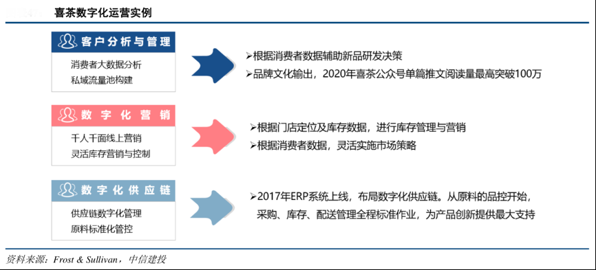 經典案例:根據Frost&Sullivan、中信建投等綜合資訊表明,在“互聯網+”時代背景下,喜茶以“喜茶 GO”小程序為基礎,利用信息化平臺更便捷地觸及消費者,實現下單、取茶和外賣一體化,將茶飲行業的數字化水平提升至新高度。