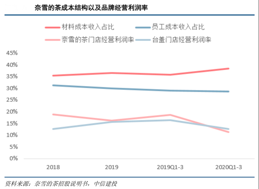 經典案例:根據奈雪的茶招股說明書、中信建投等綜合資訊表明,原料與人工是奈雪的茶主要成本。從公司產品成本結構可以發現,原料成本與人力成本是核心成本項目,2020 年前三季度兩項目分別占收入的 38%/29%。奈雪的茶、臺蓋2020 年前三季度門店經營利潤率分別為 11%/13%,雖然臺蓋利潤率略高,但由于其規模較少對公司總體收入貢獻有限。