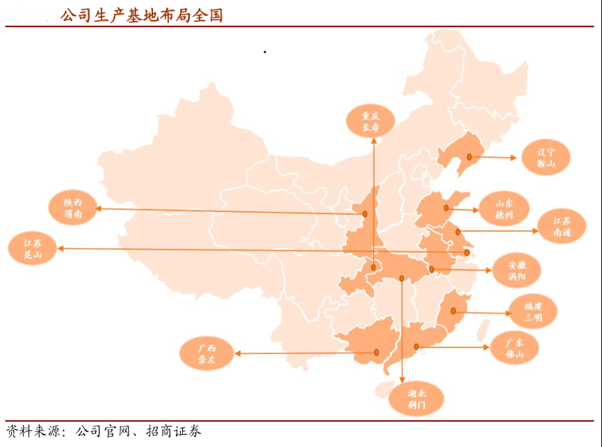 經典案例:根據公司官網、招商證券等綜合資訊表明,截至 2020 年年底,科順股份公司已在全國建成 8 個生產基地, 共布局 11 個,分別位于佛山、昆山、南通、重慶、德州、鞍山、荊門、渭南、三明(在建)、渦陽(擬建)、崇左(籌建),產能覆蓋基本實現全國化布局,實現產品運輸半徑 500 公里,且選址靠近下游市場需求+原材料供應充足,保障了對下游需求的及時響應。