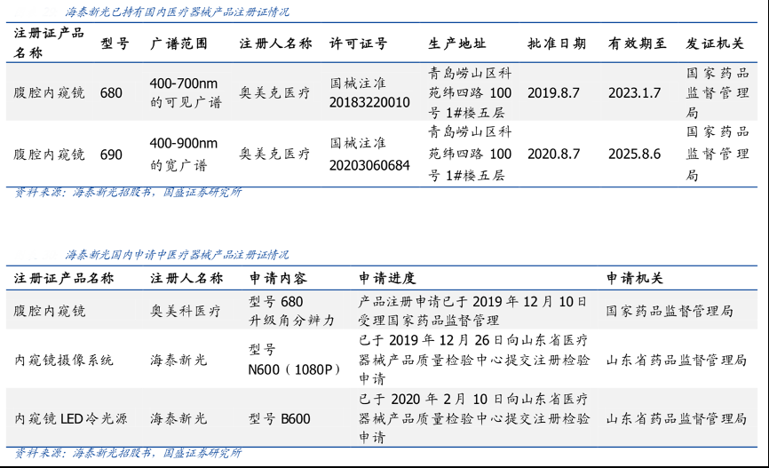 經典案例:根據海泰新光招股書、國盛證券研究所等綜合資訊表明,目前海泰新光公司的 4K 超高清熒光內窺鏡(腹腔鏡)已于 2020 年在國內獲批,目前正在積極 進行 4K 超高清圖像技術、光源技術的研發,有望在 2021 年陸續獲批,未來將形成集 光 、機、電 、算技術為一體的自主品牌內窺鏡整機系統,為臨床醫學提供全套解決方案。