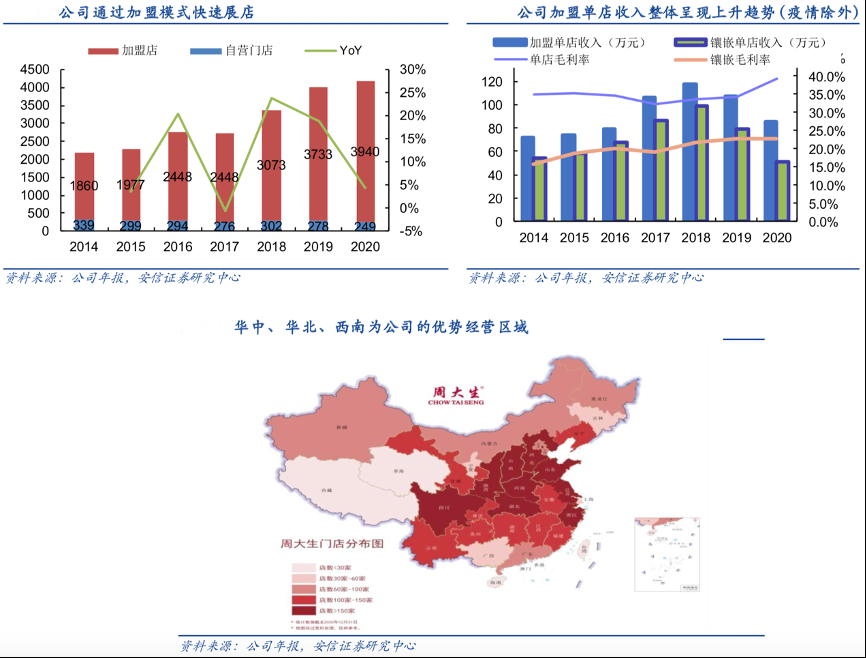 經(jīng)典案例:根據(jù)公司年報(bào)、安信證券研究中心等綜合資訊表明,周大生公司截至 2020 年底,門店數(shù)量已經(jīng)達(dá)到4189 家,其中 3940 家為加盟店, 門店數(shù)量位居國(guó)內(nèi)珠寶品牌第一,且在全國(guó)多個(gè)省市實(shí)現(xiàn)了密集化布局。2019年其加盟商的單店收入達(dá)到 108 萬(wàn)元,其中鑲嵌收入為 79 萬(wàn)元,5 年 CAGR 分別為 8.4%/7.8%,單店毛利率/單店鑲嵌毛利率也保持相對(duì)穩(wěn)定,體現(xiàn)了公司高質(zhì)量的渠道建設(shè)能力。