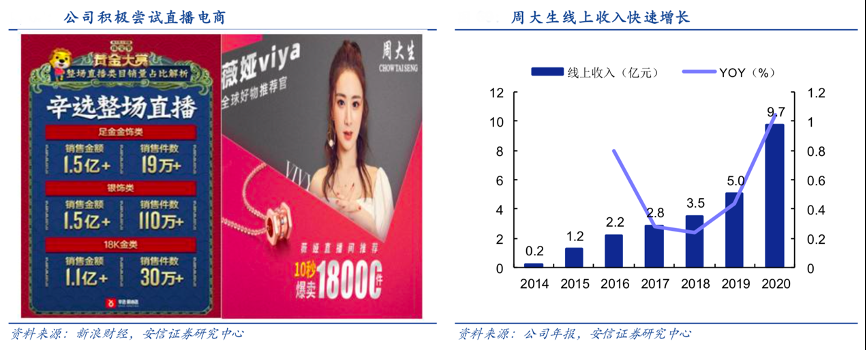 經(jīng)典案例:根據(jù)公司年報(bào)、新浪財(cái)經(jīng)、安信證券研究中心等綜合資訊表明,2014年周大生便成立電商團(tuán)隊(duì),目前線上運(yùn)營(yíng)團(tuán)隊(duì)達(dá)到 150 人,2020 年實(shí)現(xiàn)銷售收入 9.7 億元(+94%),占總收入比重接 近 20%。公司持續(xù)發(fā)力線上業(yè)務(wù),推進(jìn)多平臺(tái)合作,2020年其天貓旗艦店/集市店/飾品旗艦店/ 抖音店分別貢獻(xiàn)線上收入比重為53.83%/20.01%/6.78%/14.33%,其他由快手、蘇寧等貢獻(xiàn)。